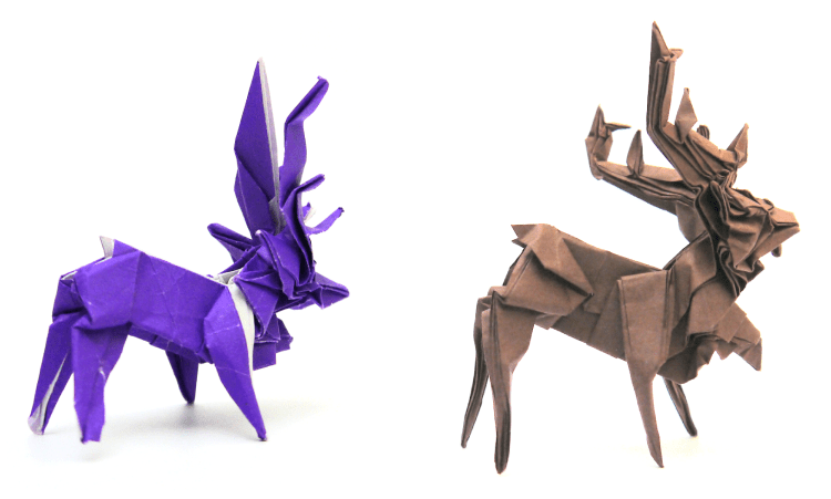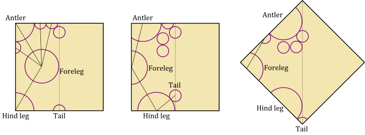 | Pros: | •Details on the antlers are easy to make using radial axial creases from the foreleg •Easy references for the big flaps | •Foreleg and hind leg will be the same thickness (both edge flaps) •We have lots of wiggle room for the antler flaps – the above image just shows one option | •The Foreleg and hind leg will be the same thickness (both of these are edge flaps) |